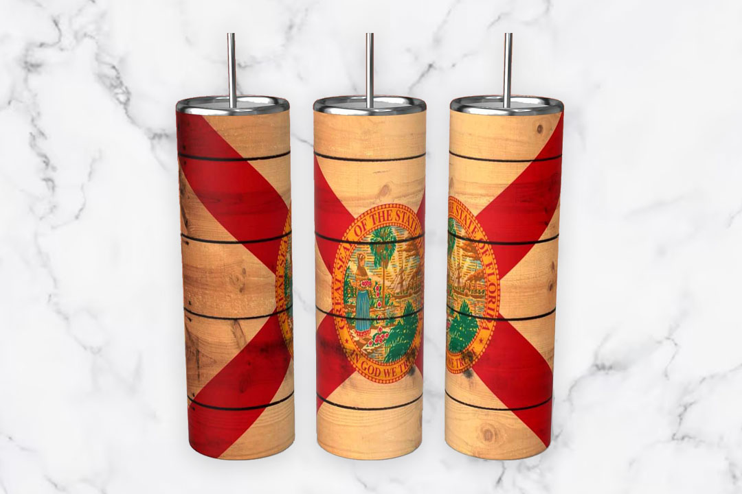 The outer surface of the tumbler features a sublimation print, a printing technique that allows for vibrant and detailed designs. The State of Florida Flag tumbler showcases the flag’s distinctive elements, such as the red cross of St. Andrew against a white background, with the state seal at the center depicting a Seminole woman, a sabal palm, and a steamboat. It serves as a visual celebration of Florida’s unique heritage and identity.